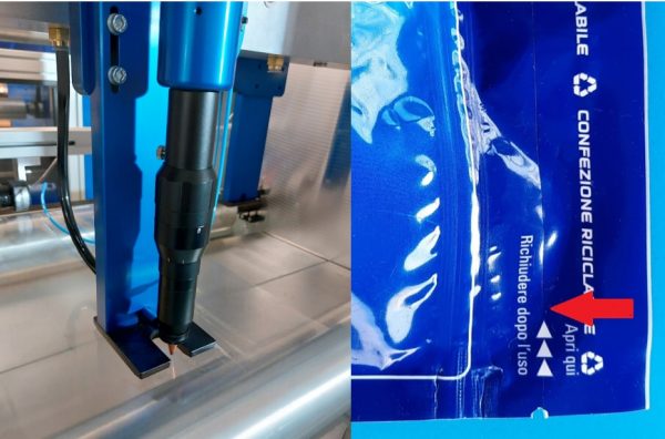 Our Laser MOD. SM-LS is a laser scoring in machine direction for flexible film packaging maintaining the integrity of the product inside. (easy-pen melting the top layer). The depth of scoring and penetration into the material being processed can be controlled accurately and Laser focus can be adjusted for the material being processed. Lasers are typically modular and can be mounted on just about any line.